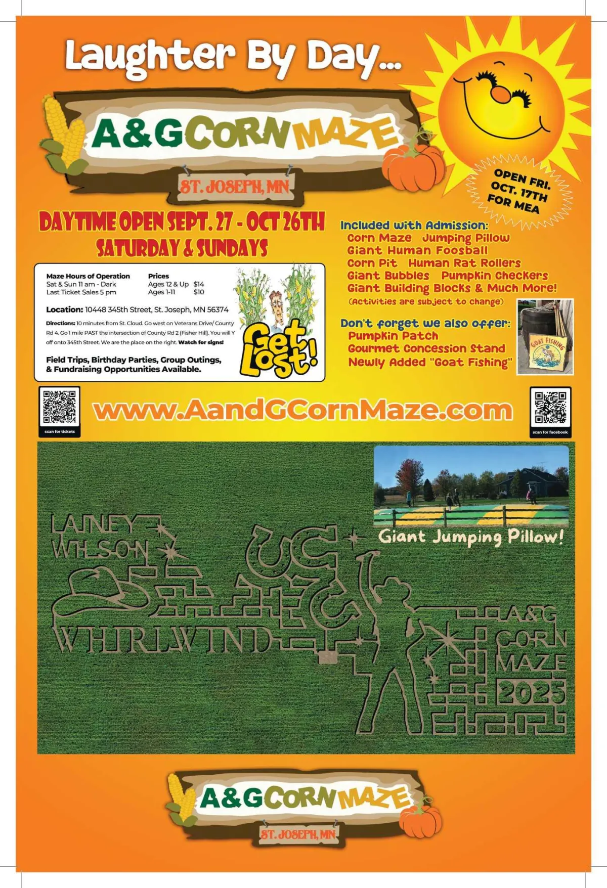 Paid admission includes one day of unlimited access to our corn maze, Giant Jumping Pillow, Human Hamster Wheels, Human Foosball, pumpkin checkers, making giant bubbles, seeing farm animals*, corn pit, heated building, free parking, and more.